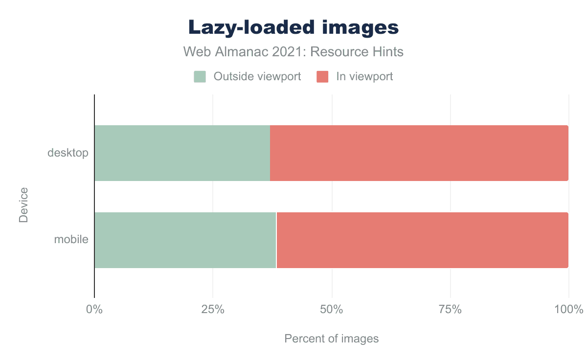 61.5% of lazy-loaded images on mobile and 63.1% of lazy-loaded images on desktop are actually within the initial viewport and shouldn’t be lazy-loaded. A study on the load times for pages which use lazy-loading indicated that pages which use lazy-loading tend to have a worse LCP performance, possibly caused by overusing the lazy-loading attribute. This is increasingly significant on the LCP element, which shouldn’t be lazy-loaded. If you are using loading="lazy", you should check that the lazily-loaded images are below the fold and more critically, that the LCP element is not lazy-loaded. You may dig deeper into the effects of lazy-loading the LCP image on your Core Web Vitals in the Performance chapter.