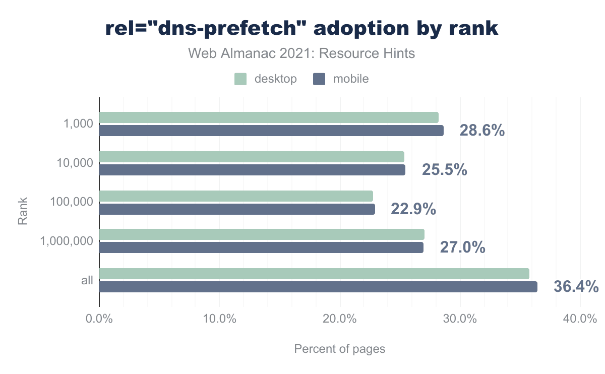 Figure 20.4. Adoption of rel="dns-prefetch" segmented by CrUX rank.