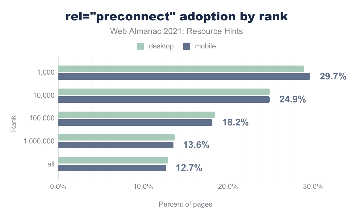 You can observe that when segmenting the data by rank, the adoption rates change notably, with the preload hint increasing from 22.1% for our whole data set, to claim the top spot with an adoption rate of 44.3% amongst the top 1,000 sites.