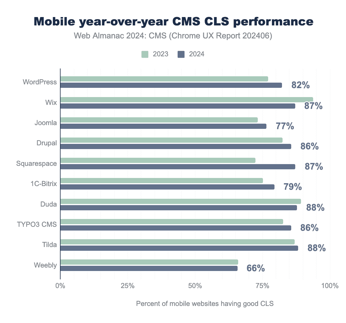 Comparing yearly data shows that the CLS results aren’t as impressive as the LCP or the overall CWV pass rates. Most platforms made little progress, while Duda, Wix, and Weebly struggled to improve their 2023 results.