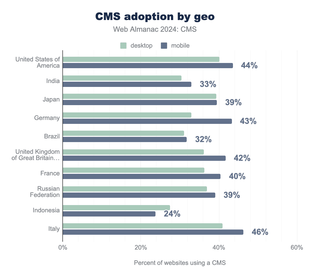 CMS adoption is highest in Italy and Spain, where 46% to 44% (40% to 41% in 2022) of mobile sites are built with a CMS. Brazil and Indonesia have the lowest adoption rates, with only 32% and 24%, respectively. Japan is seeing steady growth in mobile CMS adoption—39% in 2024 compared to 32% in 2022. Conversely, India shows a slight decrease in adoption (2% since June 2022). This can be attributed to the growing dataset and tracked URL increase, which helps us better understand the Indian web development market.