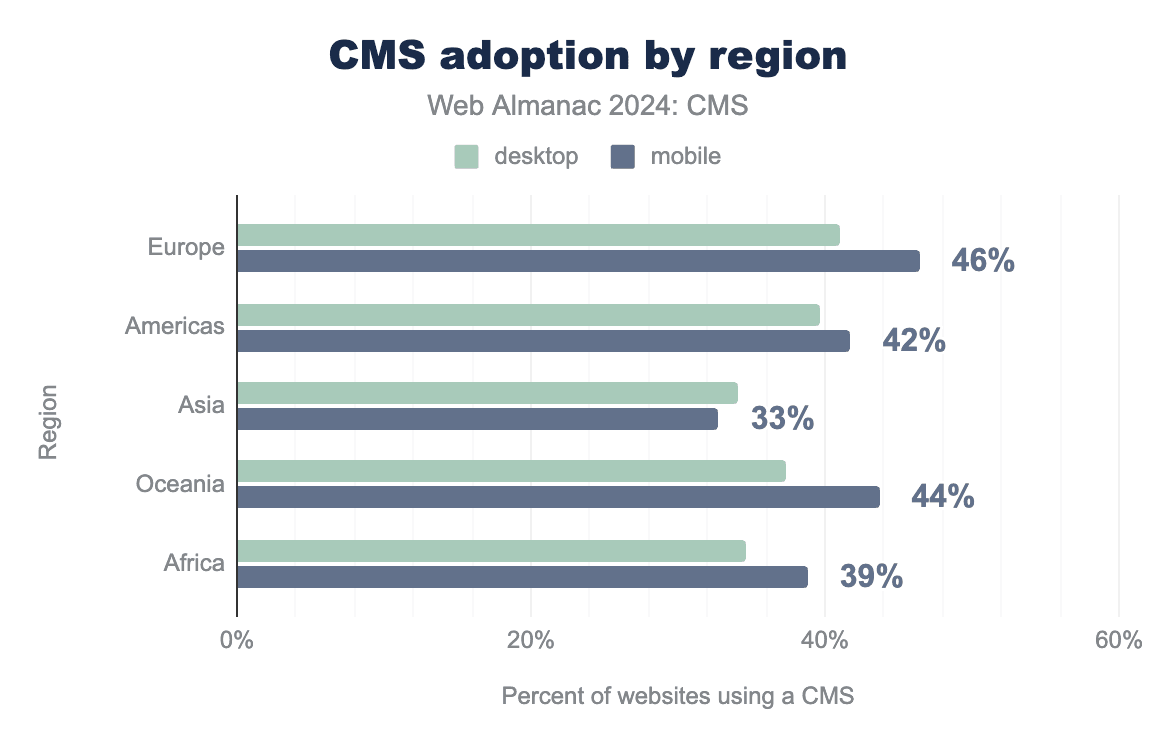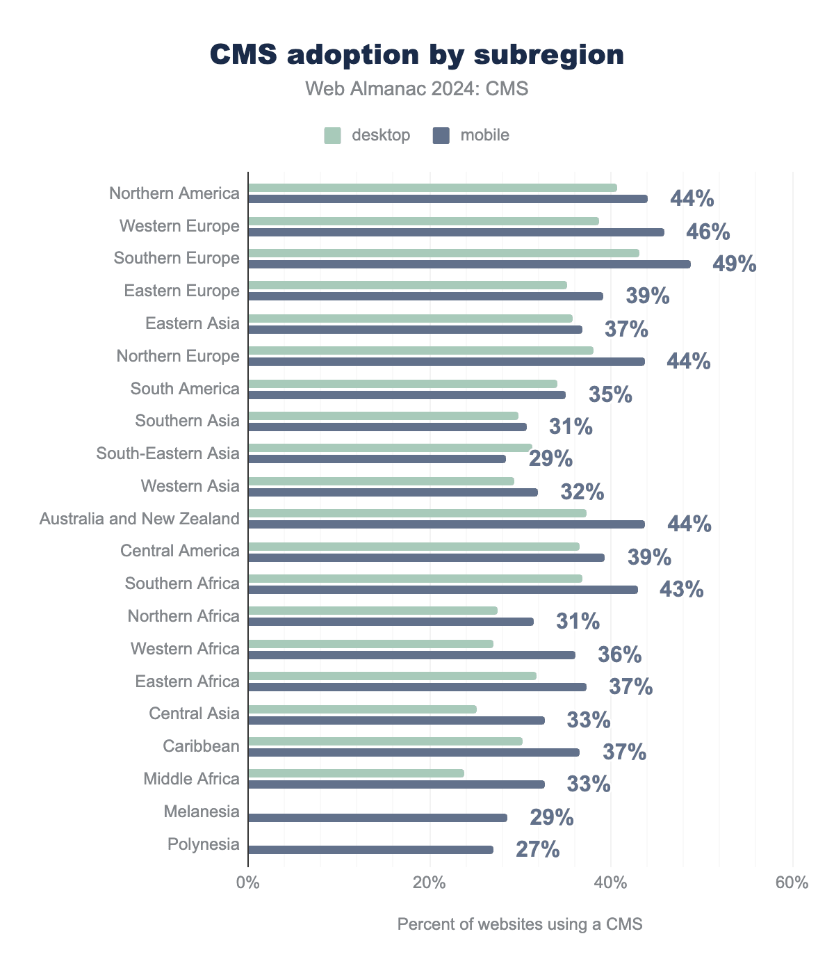 This year, unlike our analysis in 2022, we differentiate between countries and regions to offer better insights into geographical CMS usage.