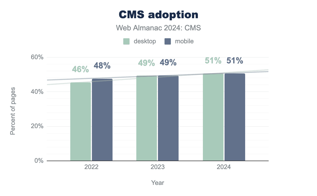 As of June 2024, 51% of the websites in the Web Almanac’s desktop dataset were powered by a CMS, a steady increase compared to 2022. The mobile dataset shows an increase from 48% in 2022 to 51% in 2024.