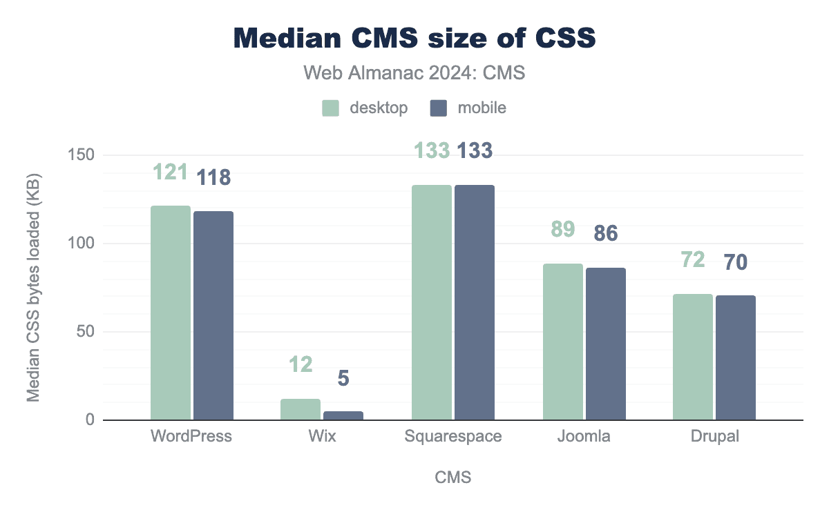In 2024, we see a different distribution between platforms that strengthens the case for inlining CSS. Wix delivers the fewest CSS resources, dropping from 9 KB to 5 KB on mobile views in 2022. Squarespace delivers significantly more CSS this year—133 KB from 89 KB in 2022. WordPress comes second in CSS delivery with a slight increase from 2022 numbers. Drupal also shows a minor increase, while Joomla is the only CMS platform that delivers less CSS in 2024.