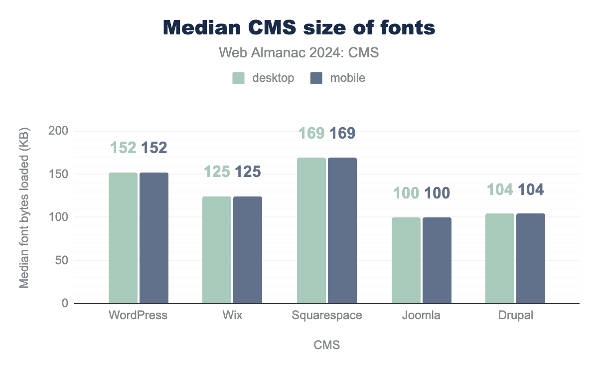 This year, all top five CMSs show changes in the amount of font bytes delivered. Squarespace continues to deliver the highest amount at 169 KB (a significant decrease from 202 KB in 2022). Wix also shows a slight decrease in font file delivery, while WordPress, Joomla, and Drupal all have increased the amount of font bytes served. It would be interesting to see if the growing integration of Google-hosted fonts will impact next year’s results.
