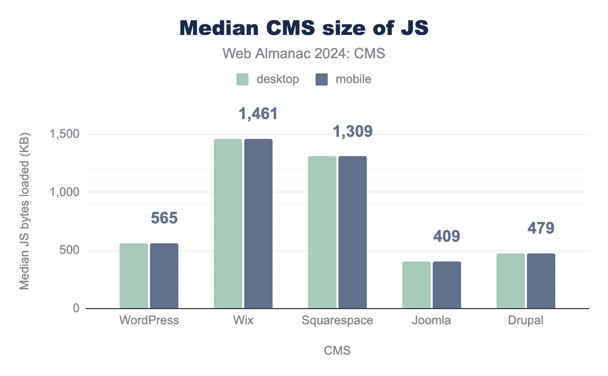 In 2024, we observe rising JavaScript usage across the board. Almost all top five CMSs deliver more JavaScript compared to 2022 data, with Squarespace seeing a major increase, from 997 KB to ~1,3 MB. Wix still delivers the most JavaScript with a slight increase, from ~1,3 MB to ~1,4 MB. Drupal and WordPress show minor JavaScript growth, with Joomla delivering the least JS at 409 KB (an improvement from 2022’s 452KB).