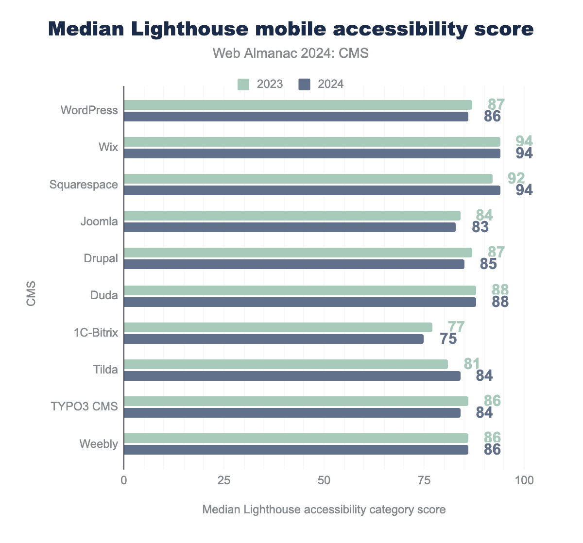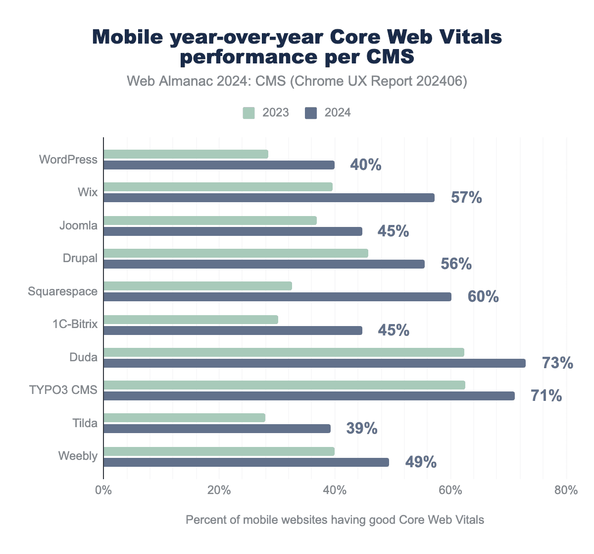 Considering how much they have improved since 2023, Squarespace is again ahead of the other CMSs with a YoY improvement of 27%. Wix is in second place with 13%, and WordPress is third with 11%. The remaining platforms improved by less than 10%.