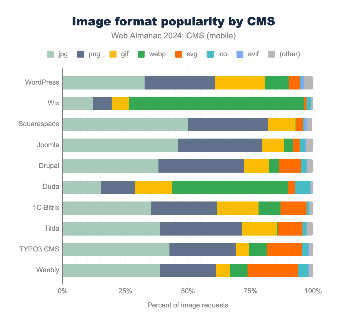 As of WordPress 5.8, WordPress supports the WebP format and can be set to automatically convert uploaded images to WebP. However, the popularity of the format seems to have plateaued compared to the 2022 data. This can be explained by the more holistic approach the core Performance team at WordPress has chosen toward general performance improvements on the platform. Read more in the section WordPress in 2024.