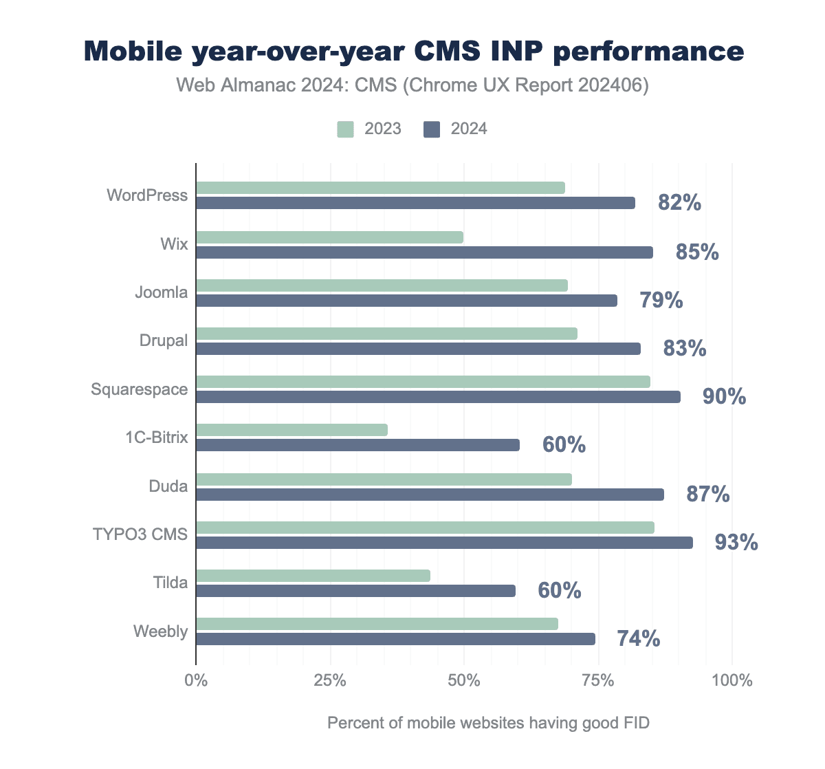 That said, the YoY improvement and overall CWV pass rate demonstrated by the top 10 CMSs is even more impressive, considering the big changes INP introduced.