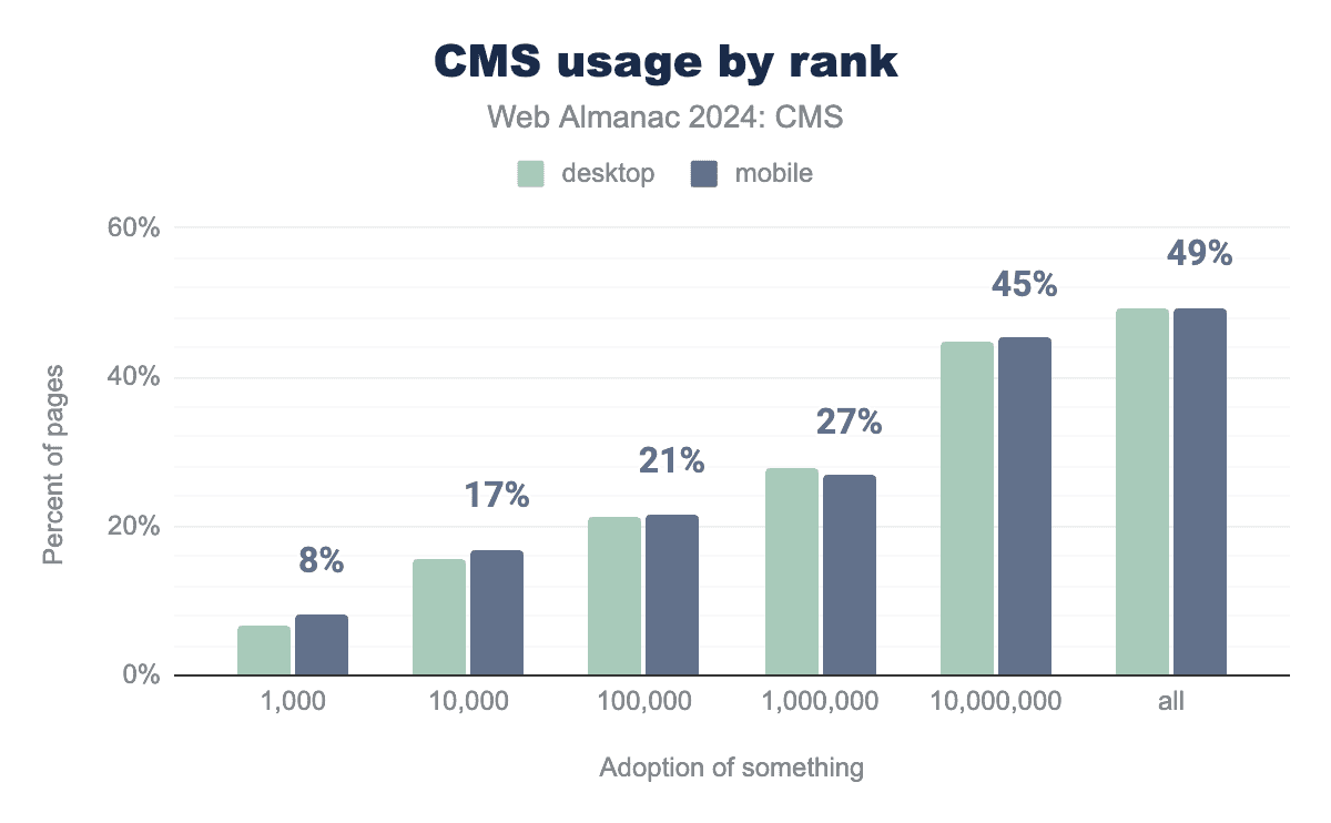 According to the dataset, CMSs are used by approximately 8% of the top 1,000 websites for both desktop and mobile, even though 49% of all mobile sites in the dataset use a CMS.