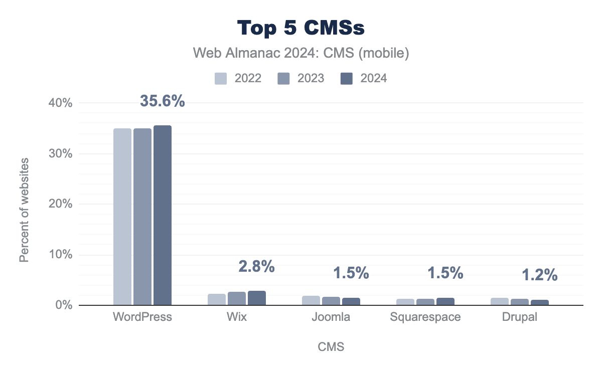 Among all websites that use an identifiable CMS, WordPress sites account for the majority of the relative market share—with over 35% adoption on mobile in 2024—followed by Wix (2.8%), Joomla (1.5%), Squarespace (1.5%), and Drupal (1.2%).