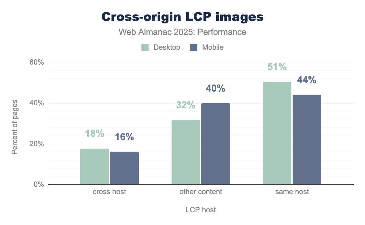 51% of desktop pages and 44% of mobile pages serve their LCP image from the same host as the document. Cross-hosted LCP images account for 16-18% of pages—a meaningful portion that may be paying a connection overhead cost unless mitigated with preconnect hints.