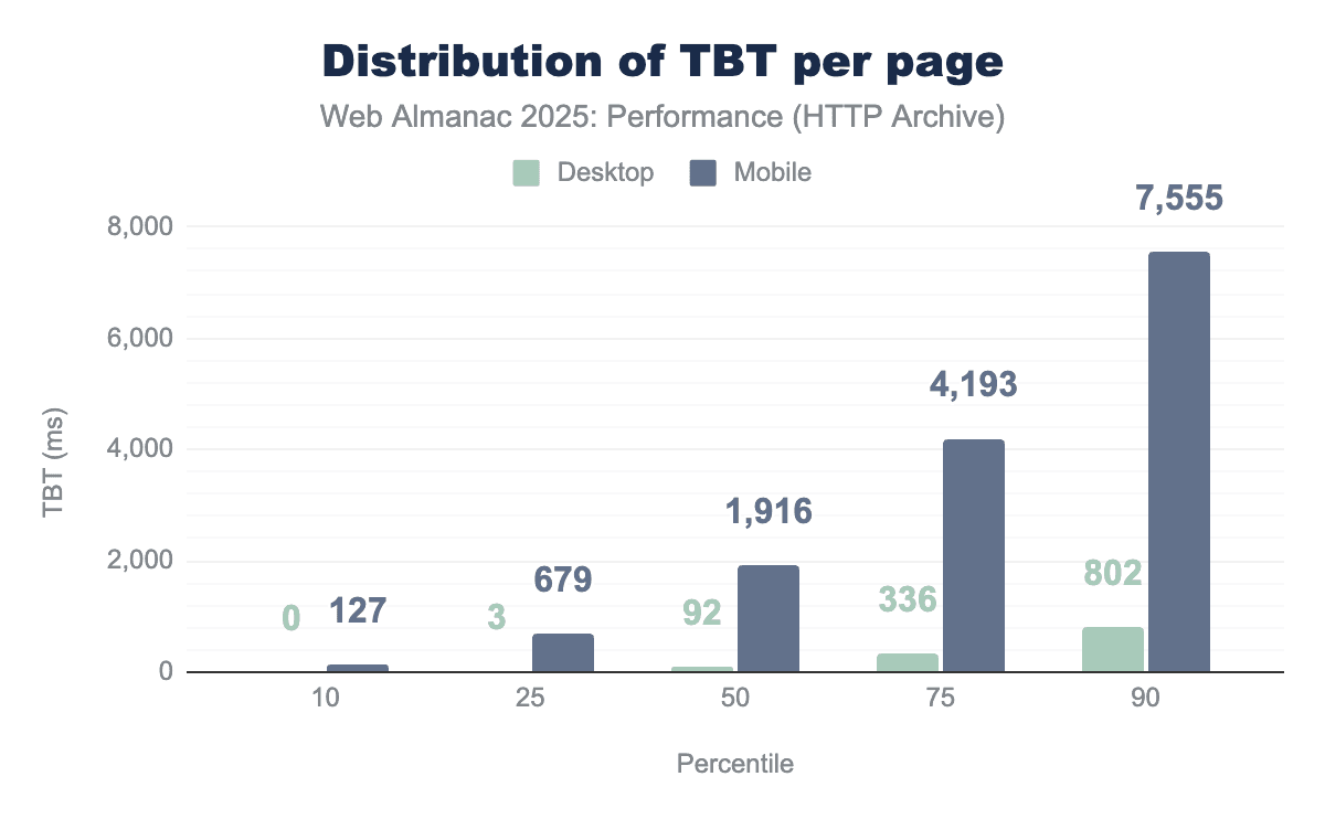 Taken together, improvements in FCP between 2024 and 2025 align with these modest gains in server response times and small reductions in render-blocking work. This suggests that incremental improvements across both network delivery and client-side rendering are contributing to earlier first paint, with slightly more impact on mobile devices.
