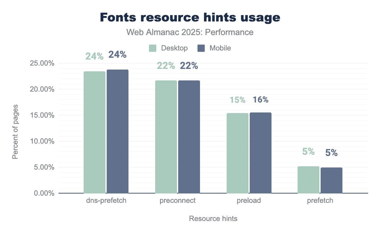 Font resource hint usage is very similar across desktop and mobile. About 24% of pages use dns-prefetch and 22% use preconnect, which mainly helps in reducing connection setup time. Preload is a good way to make fonts available early during rendering but is used on only 15-16% of pages. Even fewer pages, around 5%, use prefetch, which is generally less useful for fonts needed during the initial page load. This suggests there is substantial opportunity to improve font performance through more targeted use of resource hints.