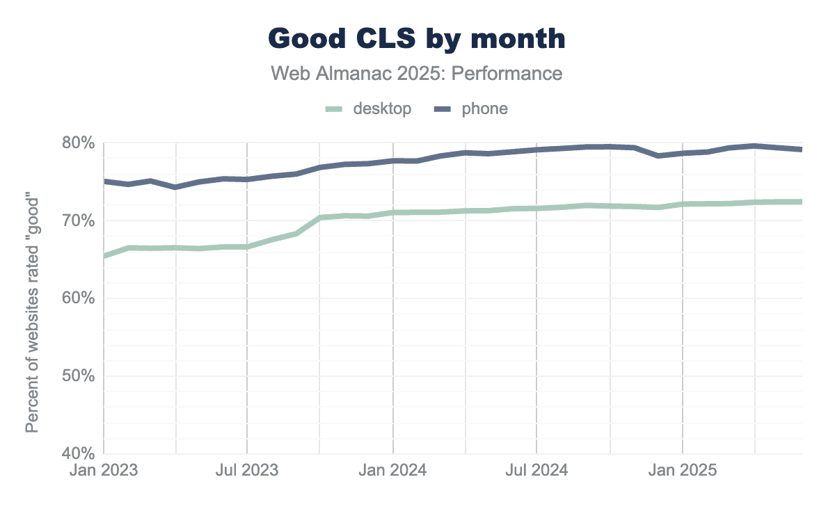Visual stability is measured by Cumulative Layout Shift (CLS) and is an indicator of how predictable and smooth pages feel to users. This section focuses on highlighting progress, device differences, and shifts over the recent years.