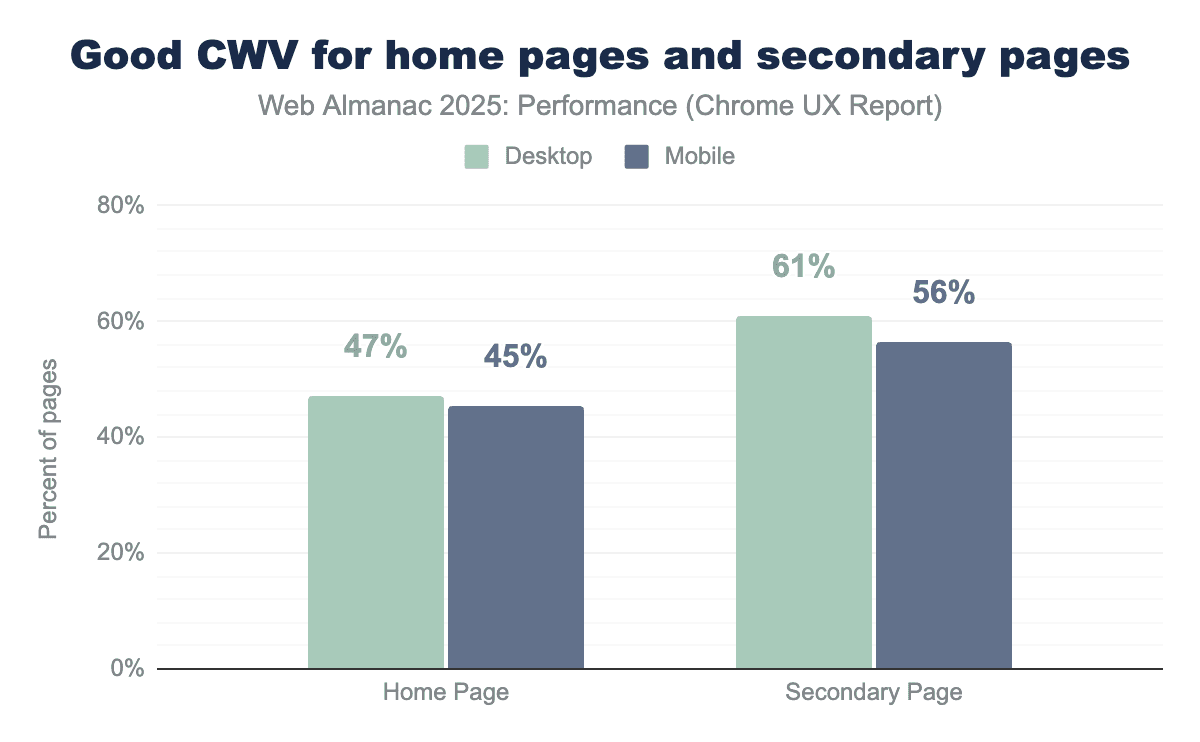 Secondary pages show higher CWV pass rates than home pages, with a 14% lead on desktop and an 11% lead on mobile. This performance gap suggests that secondary pages often benefit from having cached information, which contributes to faster page loads. Home pages are also updated more frequently and tend to include more dynamic and varied components, while secondary pages are often more templated and consistent, which may make them more stable and easier to optimize.