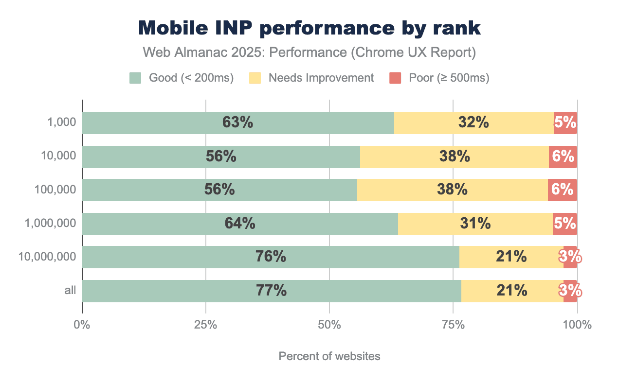 The most popular websites showed remarkable INP improvement in 2025, with the top 1,000 sites jumping from 53% to 63% good scores—a 10 percentage point gain that outpaced all other categories. This signals that high-traffic websites are prioritizing interactivity optimization, likely driven by the direct impact on user engagement and business metrics.