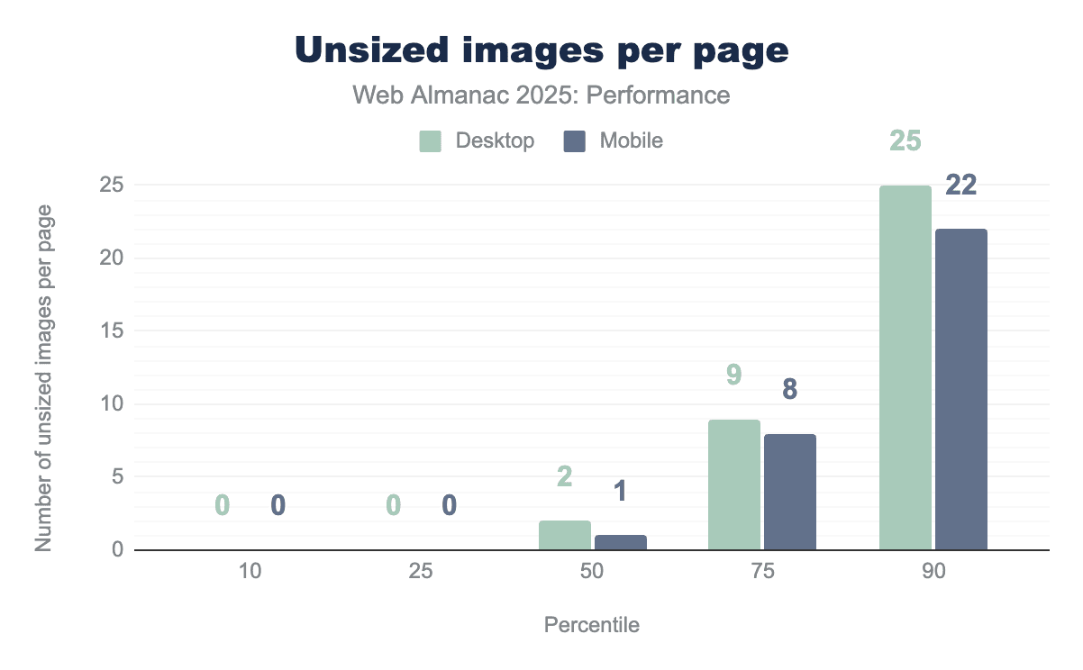 The median number of unsized images per web page is two. At the 90th percentile, this number increases sharply to 26 on desktop and 23 on mobile. Unsized images increase the risk of layout shift. However, their actual impact on CLS depends on both the size of the image and how far content shifts when it loads, especially if the shift affects the viewport. CLS is calculated based on the impact fraction (how much of the viewport is affected) and the distance fraction (how far elements move), meaning larger images or shifts closer to the top of the page tend to contribute more heavily to CLS.